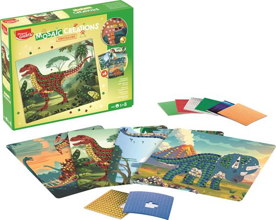 4 dinoszaurusz mintájú kártya, amelyet öntapadó mozaikokkal lehet díszíteni. Ragaszd az öntapadó mozaikokat a képekre, hogy életre keltsd a dinoszauruszokat. Praktikus készlet, amelyhez nincs szükség ragasztóra! A mozaikok könnyen felragaszthatók és tökéletesen alkalmasak a kis kezek számára.