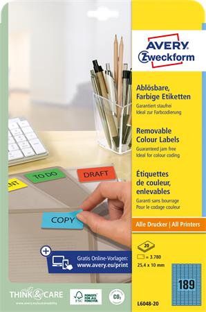 Etikett, univerzális, 25,4x10 mm, eltávolítható, kerekített sarkú, AVERY ZWECKFORM, 3780 etikett/csomag, kék